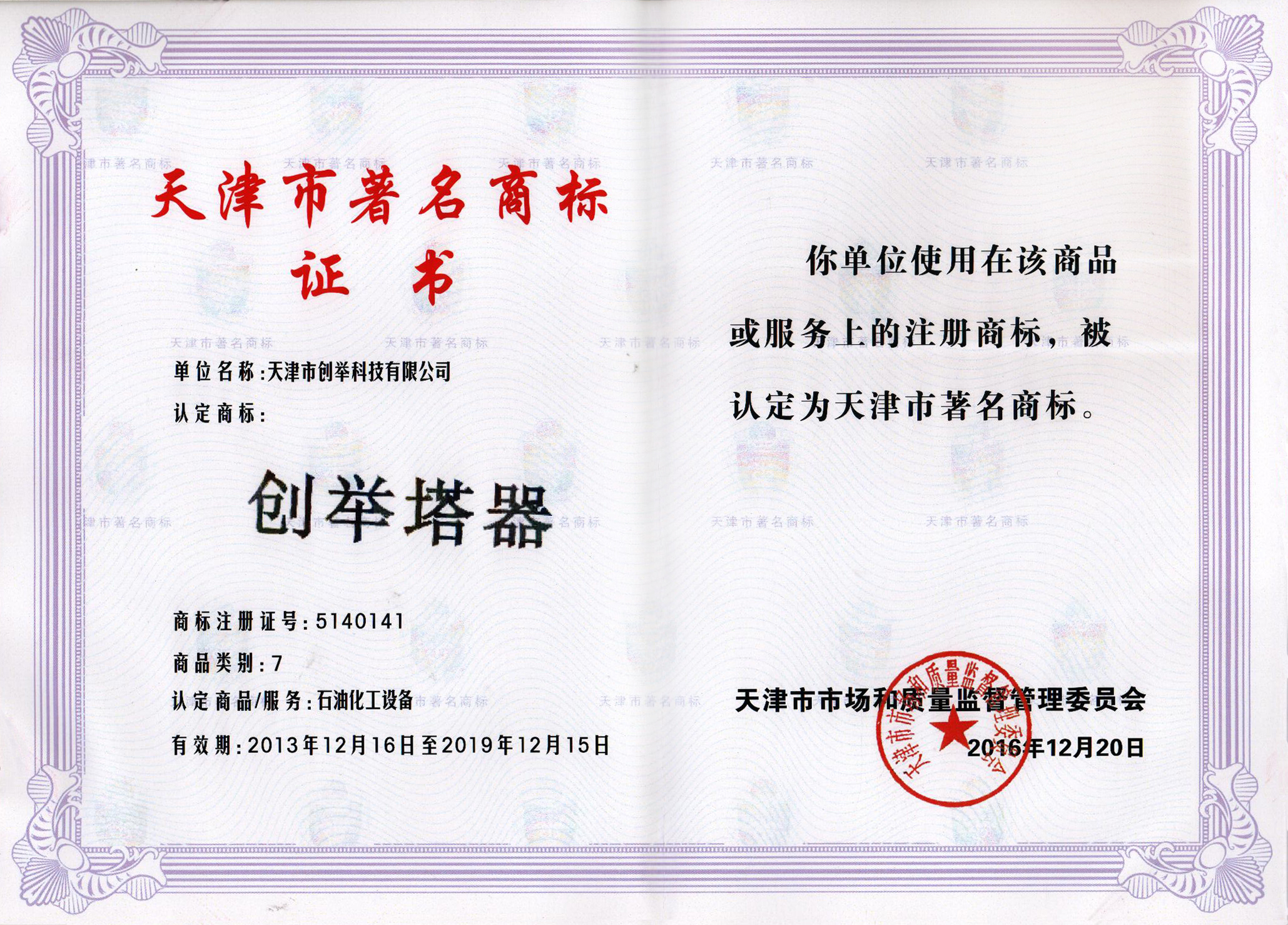 2013年 “創(chuàng )舉塔器”獲得天津市著(zhù)名商標稱(chēng)號。