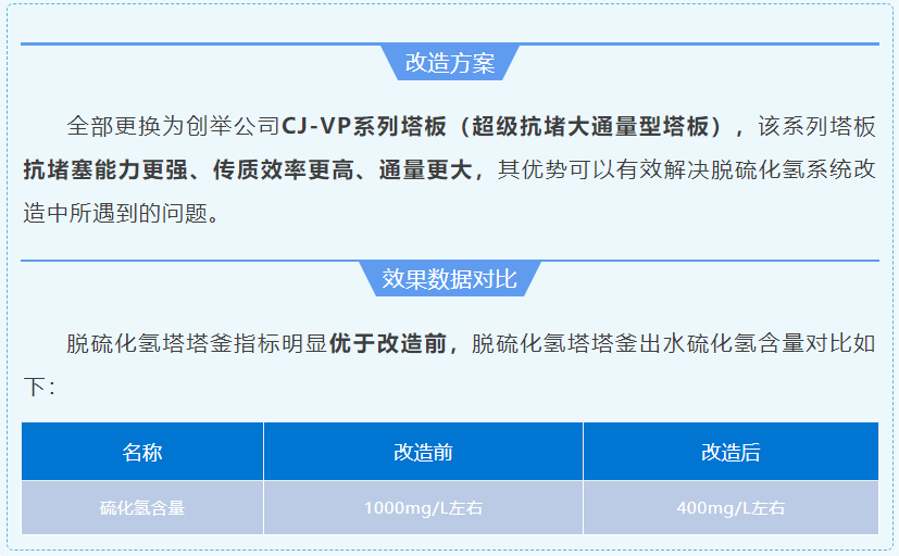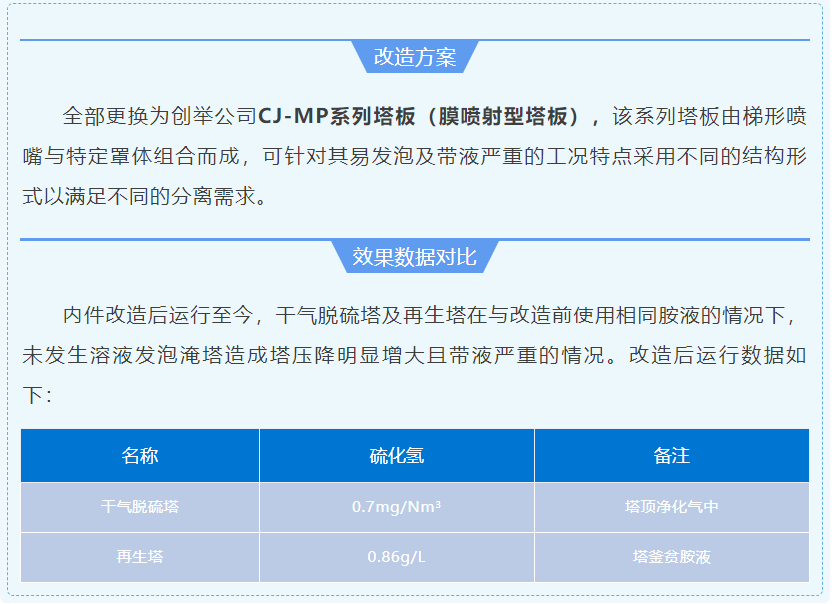 全部工程改造完工后,各項技術(shù)指標均滿(mǎn)足生產(chǎn)要求,達到了改造的目的和預期,緩解業(yè)主單位的環(huán)保壓力的同時(shí)延長(cháng)了設備檢修周期。創(chuàng )舉公司新型CJ系列高效噴射態(tài)塔盤(pán)技術(shù)在脫硫化氫塔、干氣脫硫塔及再生塔的應用效果,得到了陜西某公司領(lǐng)導的高度認可。該項目的順利開(kāi)車(chē)是創(chuàng )舉公司在行業(yè)內的又一次成功改造案例。