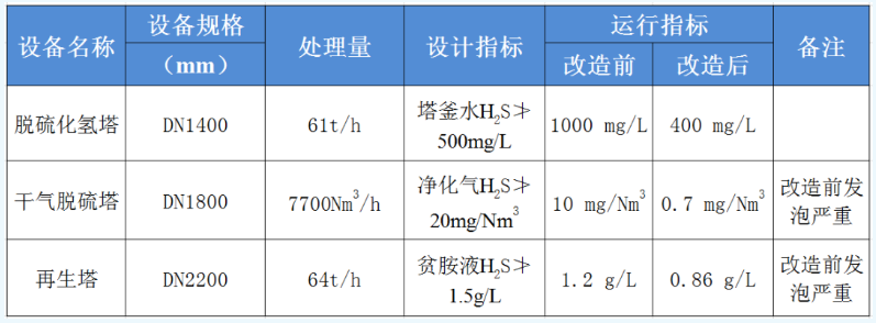 胺液是一種在濕法脫硫過(guò)程中經(jīng)常用到的溶液。由于其具有極易發(fā)泡的性質(zhì),干氣脫硫塔和再生塔在運行過(guò)程中都存在溶劑發(fā)泡淹塔的情況。且干氣脫硫塔較為明顯,出現全塔壓差增大,凈化干氣帶液嚴重的現象。在裝置整體未達到設計負荷的情況下,再生塔存在塔頂酸性氣產(chǎn)量較設計量大帶液嚴重的情況。