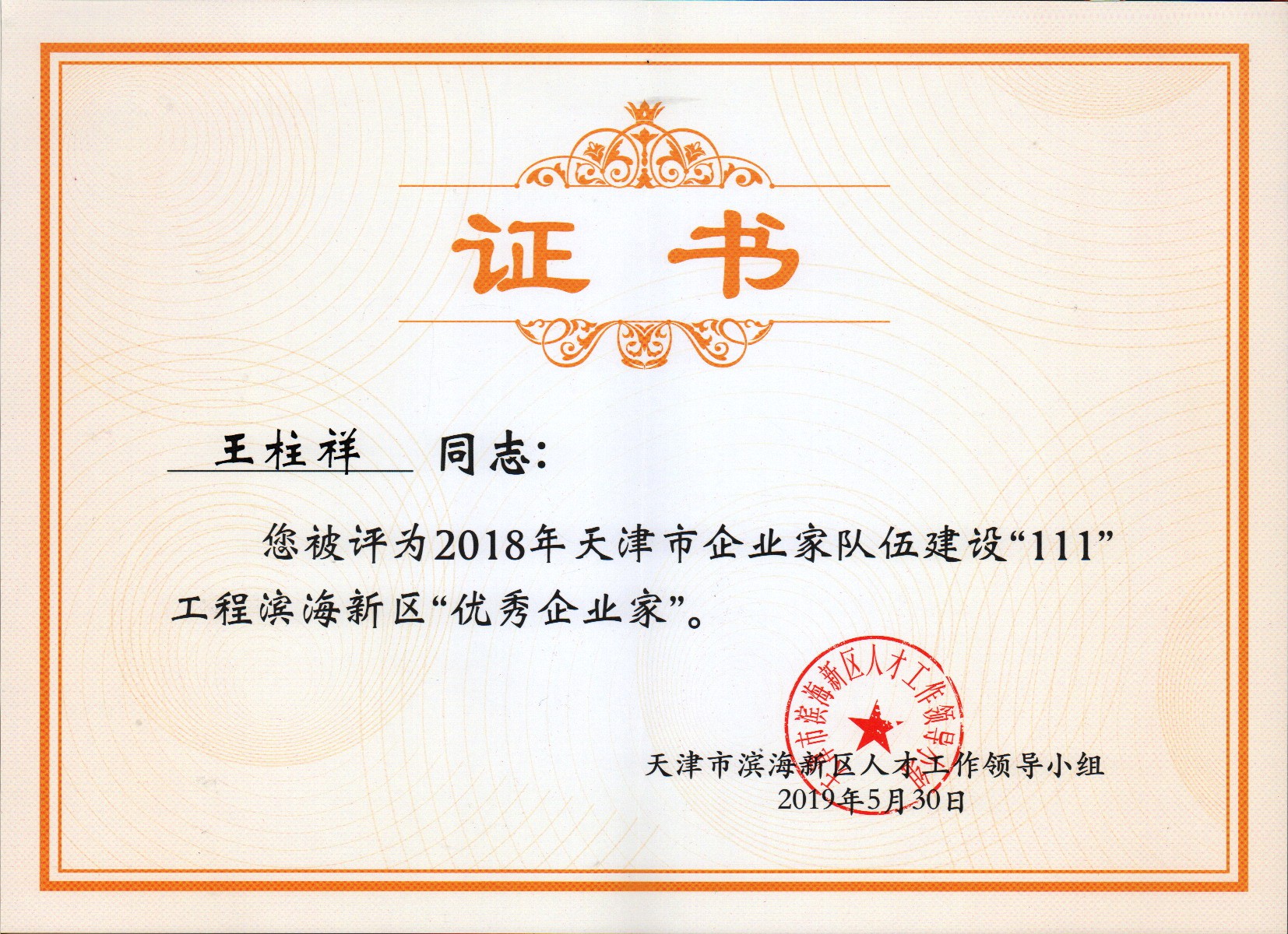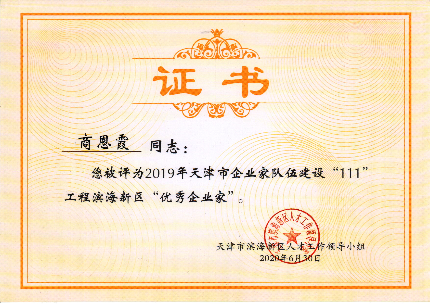 為進(jìn)一步營(yíng)造企業(yè)家創(chuàng )業(yè)發(fā)展良好環(huán)境,加大對企業(yè)家培養支持力度,天津市濱海新區開(kāi)展了第二批“優(yōu)秀企業(yè)家”申報工作,并于近期公布培養名單,商恩霞總經(jīng)理成功入選,這是公司繼王柱祥董事長(cháng)榮獲優(yōu)秀企業(yè)家之后獲得的又一項殊榮。
