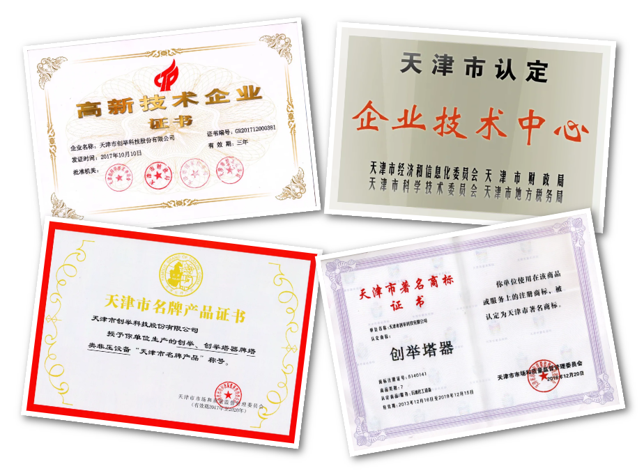 天津市創(chuàng )舉科技股份有限公司自成立以來(lái),始終堅持“務(wù)實(shí)求發(fā)展、攜手創(chuàng )繁榮”的經(jīng)營(yíng)理念,不斷追求企業(yè)管理及技術(shù)創(chuàng )新,先后被認定為國家級高新技術(shù)企業(yè),天津市守合同重信用企業(yè),天津市科技小巨人企業(yè)、“中國塔器設備制造業(yè)10強企業(yè)”、“中國化工傳質(zhì)設備十強企業(yè)”等殊榮, “創(chuàng )舉塔器”也已被評為天津市著(zhù)名商標。