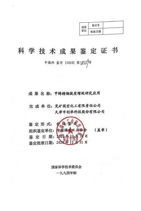 2020年底,中國煤炭工業(yè)協(xié)會(huì )組織有關(guān)專(zhuān)家,對國宏公司及創(chuàng )舉科技共同申報的“甲醇精餾提質(zhì)增效研究應用”技術(shù)進(jìn)行科學(xué)技術(shù)成果鑒定。經(jīng)專(zhuān)家鑒定,該項技術(shù)成果達到“