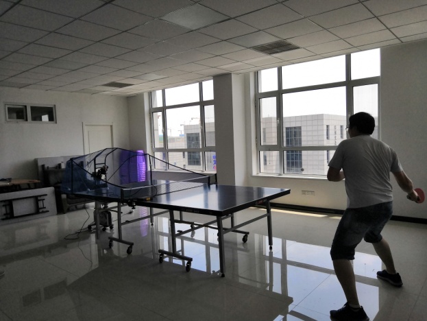你看,乒乓球臺前,新手正對著(zhù)發(fā)球機練習標準動(dòng)作,期待他能早日步入高手行列。