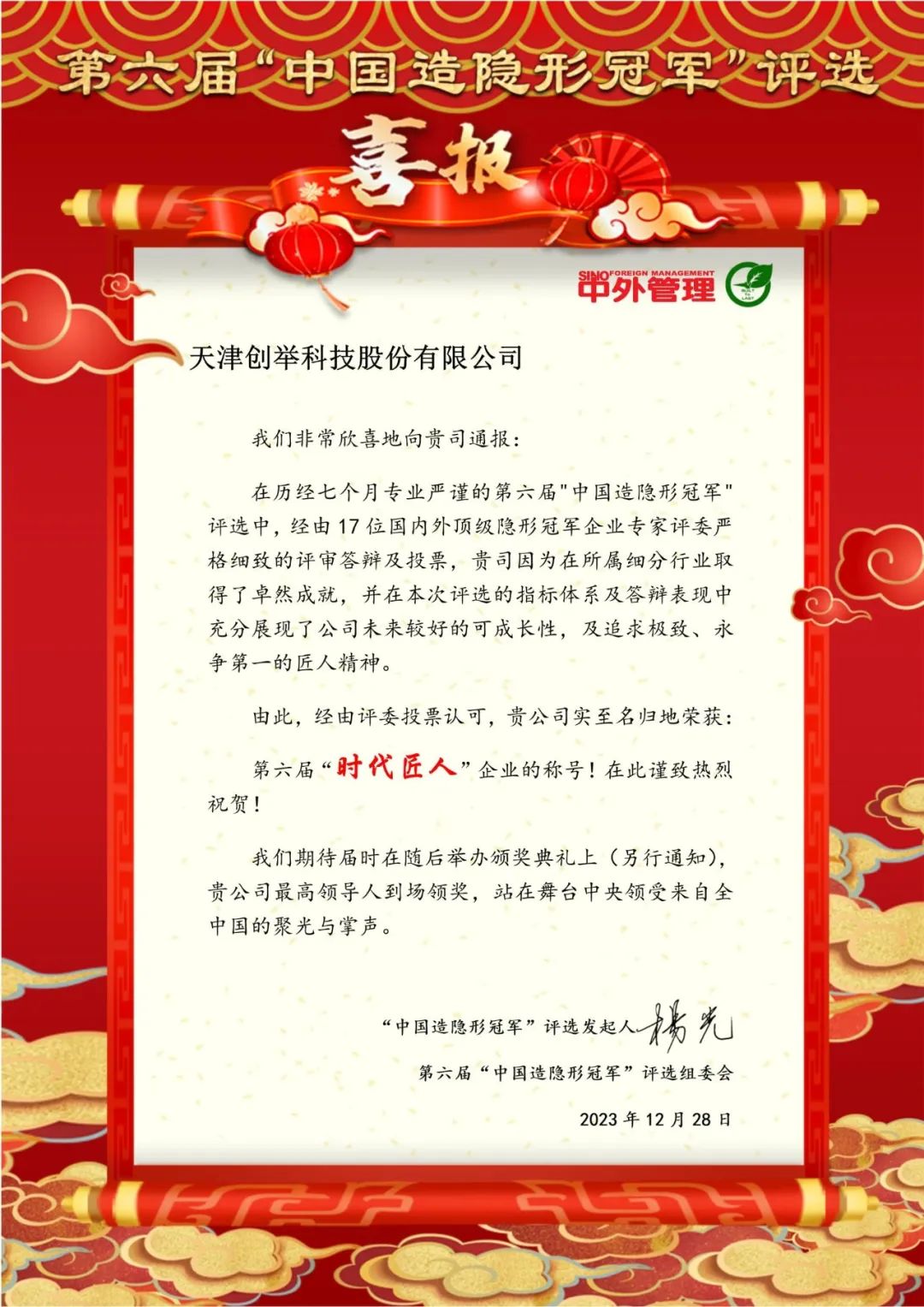 經(jīng)過(guò)18位國內外頂級企業(yè)實(shí)戰派專(zhuān)家、著(zhù)名商學(xué)院院長(cháng)、投資機構、媒體等多方嚴謹細致評定,天津市創(chuàng )舉科技股份有限公司榮獲“時(shí)代匠人”企業(yè)稱(chēng)號。