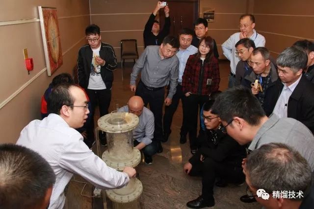 嘉賓們還觀(guān)摩了創(chuàng )舉帶來(lái)的冷模實(shí)驗塔,對逆流系列塔板的技術(shù)有了直觀(guān)的認識。