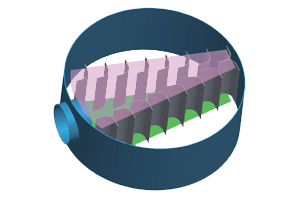 雙列葉片氣體分布器,在大塔徑塔進(jìn)氣口處設該分布器,重量輕占用塔截面積小,霧沫夾帶量小,氣體分布均勻。該分布器對塔內填料效率的發(fā)揮至關(guān)重要。該形式的氣體分布器已成功在焦化行業(yè)、煉油行業(yè)等成功應用,特別是在大塔徑上的氣體分布效果更佳,得到用戶(hù)的一致好評。